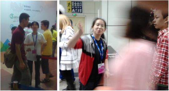 志愿者们在天色尚暗之时出发,沿着55路蜿蜒漫长的线,到达城市的另一端,抢在展会开馆之前准备就绪。黄小才同学和李泓同学负责动漫展入口的检票工作。特别是到了国庆高峰时期,馆还未开人潮已排至百米远,“撕票任务”不可谓不任重道远。从开馆至换岗,手指一刻没停,双脚站的发软却不敢擅自休息,撕到麻痹不堪时总感觉双手都快磨出血。也到过棘手难解的麻烦,有没门票还理直气壮的闯进门去的,有以各种方式想蒙混进去的,还有以为不需要票被拦下后大暴粗口的……我们有唯以微笑面对。有苦有累,但她们在谈及服务的感悟时却把困难轻轻撇开,云淡风轻地说这是第一次感受到真诚的为他人服务是那样一种幸福的感觉。