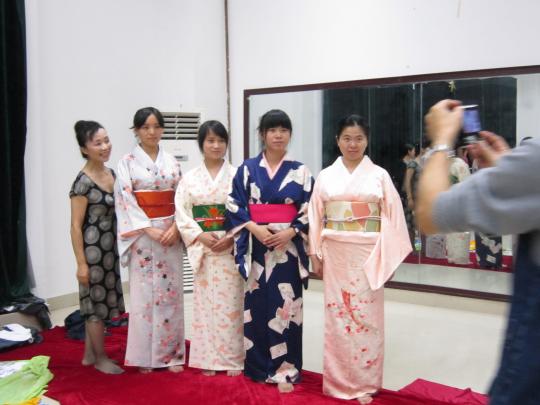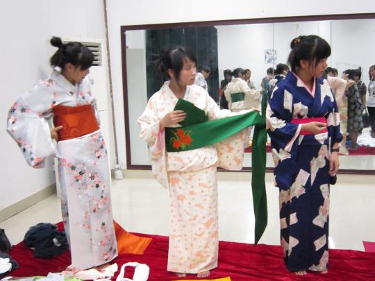 小时之久,期间整个排练厅气氛欢欣愉悦,同学们热情积极。最后,在兵頭惠夫人悉心专业的指导下,参与者身上的和服都穿出了浪漫的异国情调,典型的日本风格,堪称一场别出心裁的日本和服展示盛宴。本次来访,兵頭夫妇还向外国语学院友情赠送了他们精心准备的和服,希望加强中日交流,尤其注重文化间的互相熏陶。