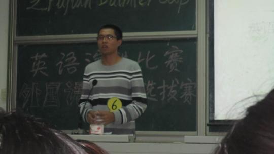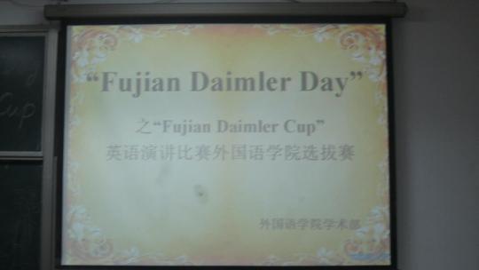 10月21日晚上7:00整,”Fujian Daimler Cup”英语演讲比赛外国语学院选拔赛在文1-204如期举行.本次大赛由外国语学院学术部举办,担任评委的有来自英语系陆神容 、郑丹妮等四位优秀的学生。此次比赛共有十名选手参加。