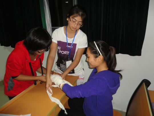 此次讲座针对运动急救和生活急救两大方面, 对急救知识展开阐述。首先,校红十字会培训部的同学以PPT的形式,深入浅出地讲解这两大方面的知识,如运动急救中的肌肉拉伤,腿骨疼痛,挫伤等,和生活急救中的中暑,烧伤处理,异物入眼等。主讲人以诙谐幽默的演讲方式和丰富的肢体语言,寓教于乐,牢牢吸引同学们的注意,并不时引发观众的开怀大笑,现场气氛十分活跃。在讲解完理论知识后,就进入了动手包扎的环节。校红十字会的同学为台下的观众分别示范了头顶帽式、单双眼、大小悬臂等八个项目的包扎,随后轮到观众亲手包扎的时间。台下的同学们边回忆边模仿着包扎的基本要领及重要步骤,开始进行包扎练习。校红十字会的同学也走入观众席为大家答疑解惑,并对同学们操作中遇到的问题予以相应的指导。9时许,在复习了一遍今晚所学内容之后,本次急救知识讲座落下帷幕。现场同学纷纷表示受益匪浅,深刻意识到推广、普及急救知识的重要性,学会急救等于学会自救和救人。