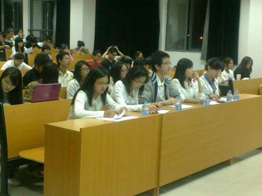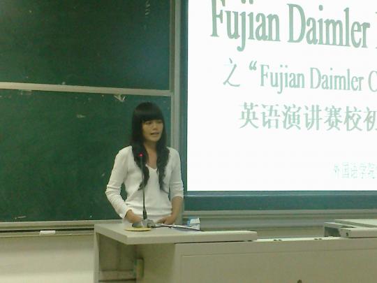 10月22日19时许,由外国语学院学生会学术部主办的”福建戴姆勒杯”英语演讲赛校初赛在文2-204举行。担任此次比赛的评委有黄晶晶、黄雪静、吴文哲等,在场观众座无虚席,耐心等着比赛的开展。