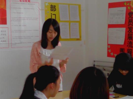 1、 主持人介绍此次活动的议程:首先由团支书向大家讲述曹阳飞宇同学的先进事迹,让大家充分了解其优秀精神。