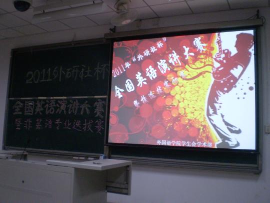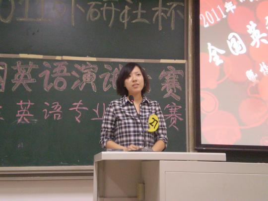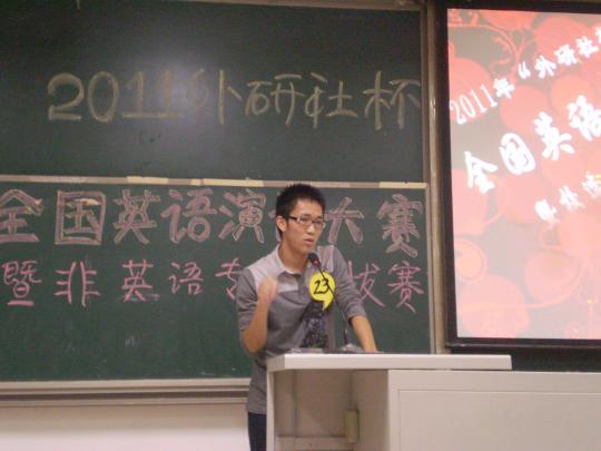 21日19时许,由外国语学院学生会学术部组织承办的2011“外研社杯”英语演讲比赛暨校级选拔赛初赛在文2-104成功举办。此次活动荣幸邀请到涂秀青、周岩、徐朝晖、黄雅珍担任评委嘉宾,另外还有来自17个学院的33名选手参加了本次比赛.