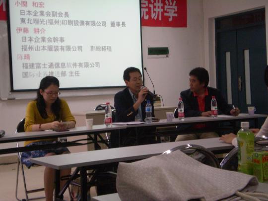 外国语学院日语系主办的名为“企业需要的日语人才”日本企业座谈会在外国语学院院办210正式拉开序幕。座谈会邀请到日本企业会副会长、东北理光(福州)印刷设备有限公司董事长小关和宏先生,日本企业会干事、福州山本服装有限公司副总经理伊藤耕介先生以及福建富士通信息软件有限公司国际业务推进部主任陈晴女士。其中,陈晴女士还曾就读于外国语学院日语系,是在场同学的直系学姐。