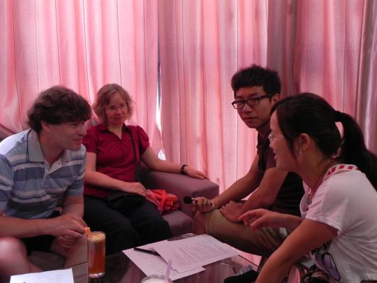 今天我们小组负责的是德国外教的采访。下午四点我们德国外教准时在学校附近的一家休闲吧里相见。这两位外教是一对夫妇,女外教Feege老师在福州生活了两年,男外教Riemer老师紧随其后来到了福州,他在福州的生活也长达一年半之久。
