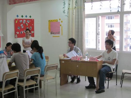 当前大学生就业形势严峻,为了让同学们尽早培养竞争与就业意识,提高同学们的面试能力,为将来的求职加分,2011年6月14日下午3点半至6点半,外国语学院09级英语3班在13号楼四楼活动室举办了以班级无领导小组讨论为主要形式的模拟面试。此次面试邀请了前校青协会长郑声童、现任校青协会长,人资部部长刘建清两位嘉宾。