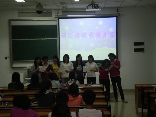 本次竞赛共分2个环节,其主体都是猜词游戏。2个环节在紧密联系的同时也呈现出难度递增的趋势。第一环节的游戏规则是小组中一成员用英语解说搭配肢体语言介绍一个单词,然后由另一成员猜出这个单词,游戏限时2分钟。在此轮竞赛中,选手们各显身手,花样百出。他们热情高涨的语言,夸张多变的肢体动作以及毫无前兆的搞笑场景带给观众们无尽的欢乐愉悦,台下不时爆发出阵阵掌声和笑声。第二轮比赛在第一轮的基础上稍作修改,适当增加了题目难度,不过选手们依旧积极参与,自得其乐。在休息环节,一些观众也被有趣的竞赛吸引,参与到活动中。整场竞赛持续将近一个半小时,其间选手们决出了高低,观众们也感受到了趣味。最后的颁奖环节,黄燕妮和张辛未同学以无可挑剔的配合夺得桂冠,孙郁雯、黄佳琳两小组则名列第二,刘婧、王姿阳、郭丽雅三个小组荣获三等奖。