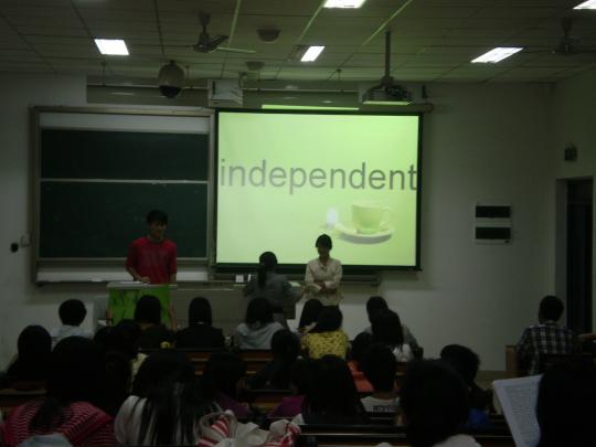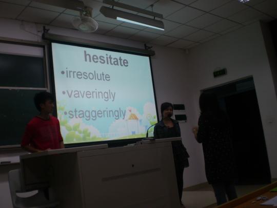 5月7日19时许,由外国语学院学术部策划组织的词汇竞赛在文1-204拉开序幕。来自外国语学院的12对选手,计24人参加了此次竞赛。本次竞赛的重点是“你说我猜”,着重突出选手间的协调配合。