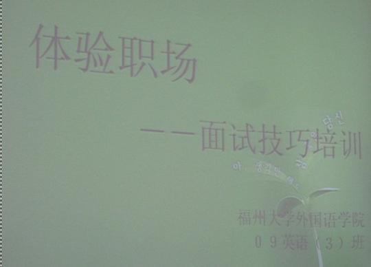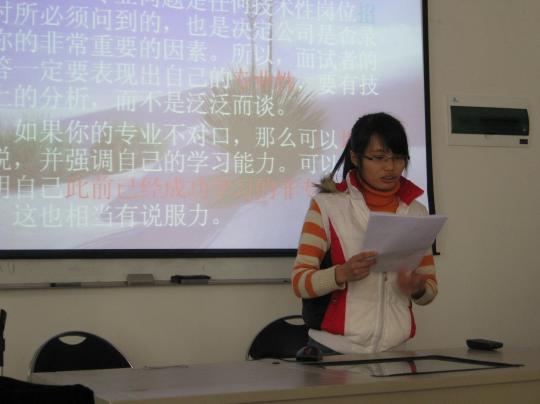 在就业竞争压力逐步增大的今天,对于毕业生来说,除专业技能外,掌握一定的面试技巧以成为群雄逐鹿中脱颖而出的重要因素。为培养同学们的就业意识与面试技巧,12月9日中午,外国语学院09级英语3班体验职场——面试技巧培训第一期在院办210拉开了帷幕。