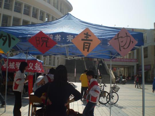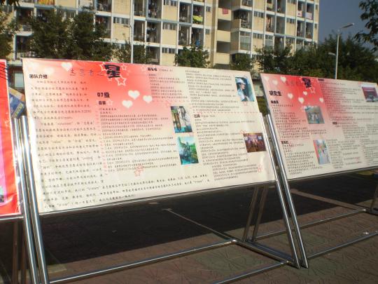 早上8时许,志愿者风采展正式拉开序幕。青年志愿者协会风采展以英语、日语、德语三类音乐为背景音乐,与学院三个学系相互呼应,充分体现了外国语学院的特色。轻快的背景音乐把我们带入一个轻松愉快的氛围,而绚丽多彩的喷绘则引领我们进入志愿者的世界。在这里,我们看到外国语学院志愿者们出色的志愿活动和不计付出的服务。外国语学院青年志愿者协会组织的支教队伍在各支教基地进行别开生面的支教活动,展示了志愿者的爱心与决心;翻译志愿者们在APEC、德语年会、科协年会等大型活动的精彩表现,体现了志愿者们的服务精神和专业的知识。最引人注目的当属“志愿者之星”活动成果展,外国语学院杨金英、江筠、陈斌峰等7名优秀志愿者的所参与的志愿活动和获奖情况让同学们不禁驻足围观。