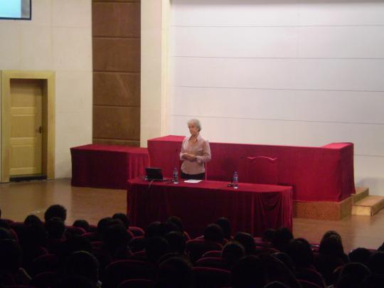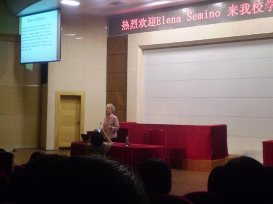 10月14日,外国语学院聘请英国兰卡斯特大学英语语言学系专家Elena Semino博士为客座教授,并在法学院模拟法庭为我们带来一场别开生面的文体学讲座。出席的嘉宾有外国语学院陈小慰院长,潘红教授,周越辅导员等。