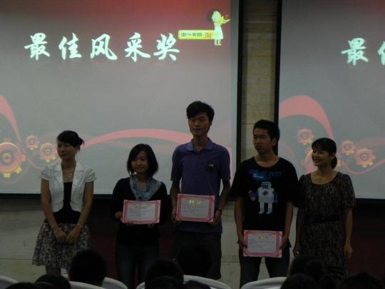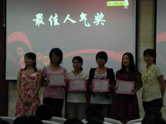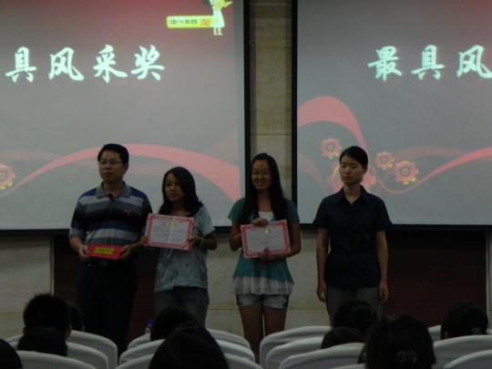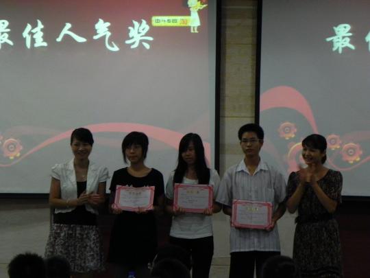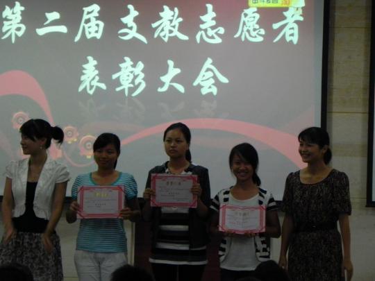 此次表彰大会为优秀志愿者颁发了多个奖项,其中包括最佳教学奖,最具人气奖和最具风采奖。刘旺书记和教师代表们为志愿者颁奖并合影留念。最后,优秀志愿者代表丁小芳同学以热情、真诚的讲话博得台下阵阵掌声。