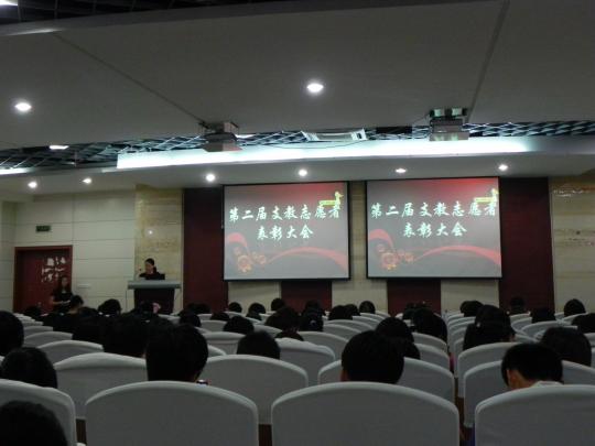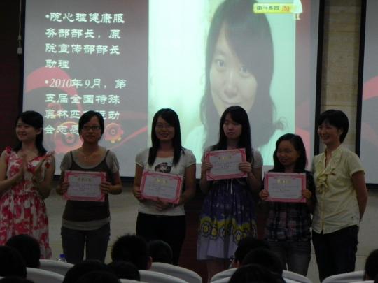 9月28日晚7点,由外国语学院青年志愿者协会主办的外国语学院第二届支教志愿者表彰大会在素质拓展中心报告厅隆重举行。外国语学院党委副书记刘旺、团委书记周越、教职工代表郑丽钦老师、外国语学院08级、09级辅导员黄柑莲和刘文婷老师、优秀志愿者代表和美岐小学、余盛小学、福州三中金山校区的教师代表们与10级全体新生共同出席了此次表彰大会。