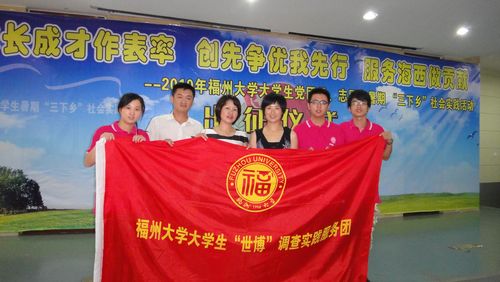 大学生“世博”调查实践服务团即将扬帆起航,在上海这方热土上播洒福大学子投身海西建设的光和热,以实际行动践行“成长成才作表率,创先争优我先行,服务海西做贡献”的主题。