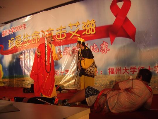 由外国语学院09级新生吴先飞、关鑫、杨丽娟等同学自编自导的话剧《大话西游》一上场就赢得了全场观众的掌声。次话剧沿用了著名电影《大话西游》的搞笑及无厘头风格,大胆改编了几句经典台词。该话剧通过讲述一位因得艾滋病被抛弃后悲愤郁结于心而最终成为艾滋妖的女子为了复仇欲将病毒传播给唐僧,而唐僧被悟空等三人解救的故事,形象生动的向观众们讲解艾滋病的传播方式,端正了人们对待艾滋病患者的态度,并且传授了帮助艾滋病患者的几种途径。