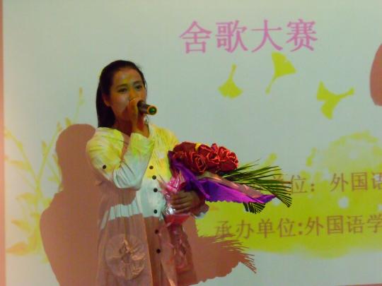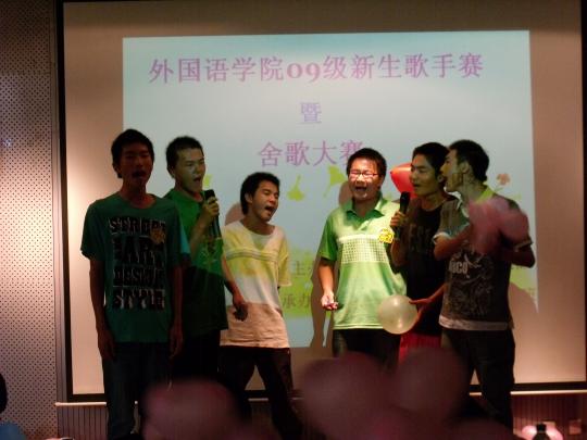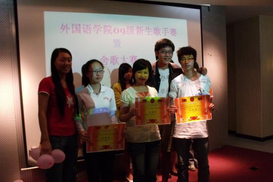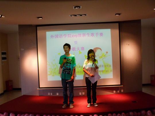 由外国语学院团委学生会文化部主办、09级英语(2)班承办的外国语学院第三届新生歌手赛于2009年11月1日下午2:30在素拓多功能厅隆重上演。09级新生辅导员刘文婷、团委学生会主席吕佳贤、团委学生会副书记黄佳丽、团委学生会副主席丁小芳、团委学生会文化部部长安然,以及建筑学院文化部部长应邀出席了此次活动,担任比赛评委并担任颁奖嘉宾。主持人由文化部副部长董雪静以及09级英语(2)班的谢作志担任。选手们使出浑身解数表现自己,台下拉拉队更是努力为选手们加油,整场活动在轻松愉快的气氛中进行。选手们给在场的观众带来一个又一个惊喜。现场气氛极其热烈!