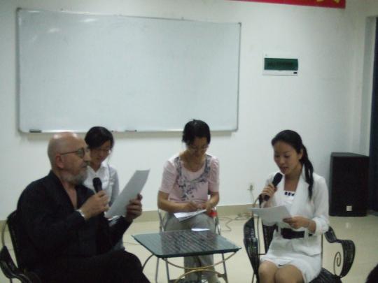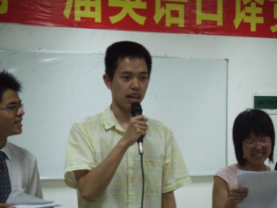 讲座伊始,Jacky以一口流利的英语介绍了一名口译人员应具备的素质—广泛的知识面、快速的反应、浓厚的兴趣、良好的短期记忆能力。接着,Jacky以一个模拟小游戏与现场同学进行互动,充分调动同学们的积极性。其间,Jacky还讲解了一些口译技巧,讲述了自己的工作经历及口译工作的特点,并剖析当前口译市场的发展前景。最后,他介绍了首届“高教社杯”全国英语口译比赛的规则、流程和奖项设置。