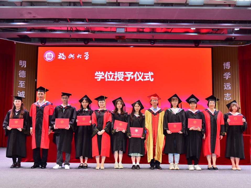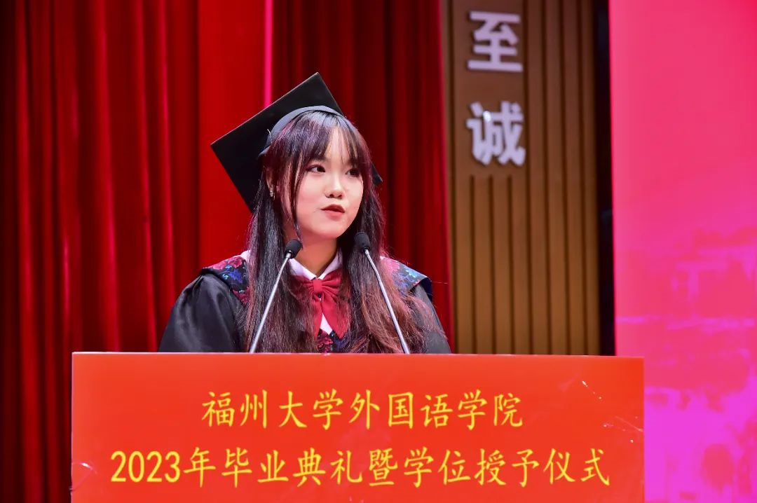 赖月艳同学回顾自己本科和研究生在福大的学习生活,表达了对母校、学院、老师、领导及教职工的衷心感谢,也祝愿同学们前程似锦。