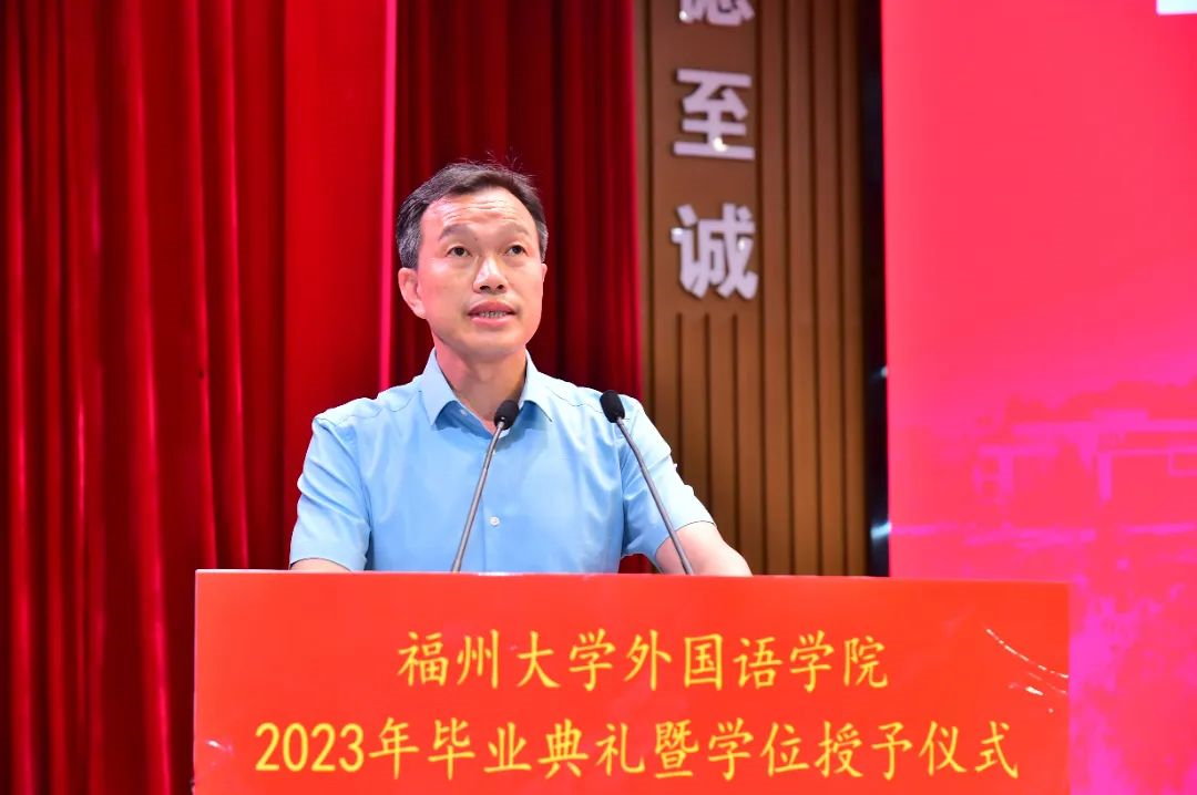 6月11日上午,Av在线观看 外国语学院于Av在线观看 图书馆博学厅隆重举行2023年学生毕业典礼暨学位授予仪式。外国语学院党委书记程贞玫、院长钟晓文教授、党委副书记蓝荣聪、副院长林继红教授、院长助理赵婧教授、院长助理甘振翎副教授,教师代表、家长代表及2020届校友代表、2023届全体毕业生及在校生代表参加毕业典礼。毕业典礼由蓝荣聪副书记主持。
