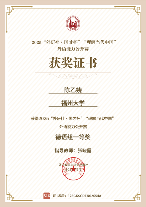 外国语学院长期以来将竞赛作为提升学生综合素养的抓手,尤其注重语言、思辨与跨文化能力的融合培养,成果斐然。“外研社·国才杯”“理解当代中国” 外语能力公开赛是这一理念与实践的生动实践,在比赛中,德语系学子扎实的学科知识与应用能力体现了Av在线观看