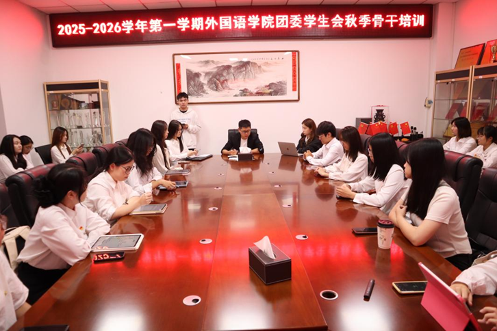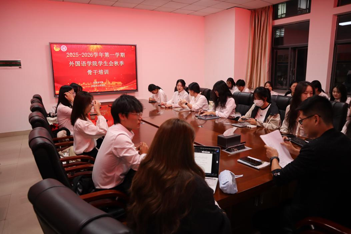 外国语学院在院办208举办2025-2026学年团委学生会“部门事务与宣传技能专项培训”骨干培训活动。本次培训旨在规范工作标准、提升宣传质效,为学院学生工作高质量发展注入动力。院团委书记唐斌湖出席,院团委学生会各部门学生骨干参训,培训由陈怡宁同学主持。