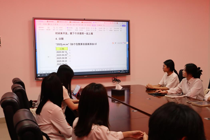 院学风服务部主要负责人黄璐同学聚焦德育评定工作,解读相关政策要求,指出上月各部门德育汇总中存在的流程疏漏与规范问题,并针对性提出优化要求。她强调,各部门需严格恪守德育工作规范,细化流程管理,确保德育材料收集、录入及汇总全环节的准确性与规范性。