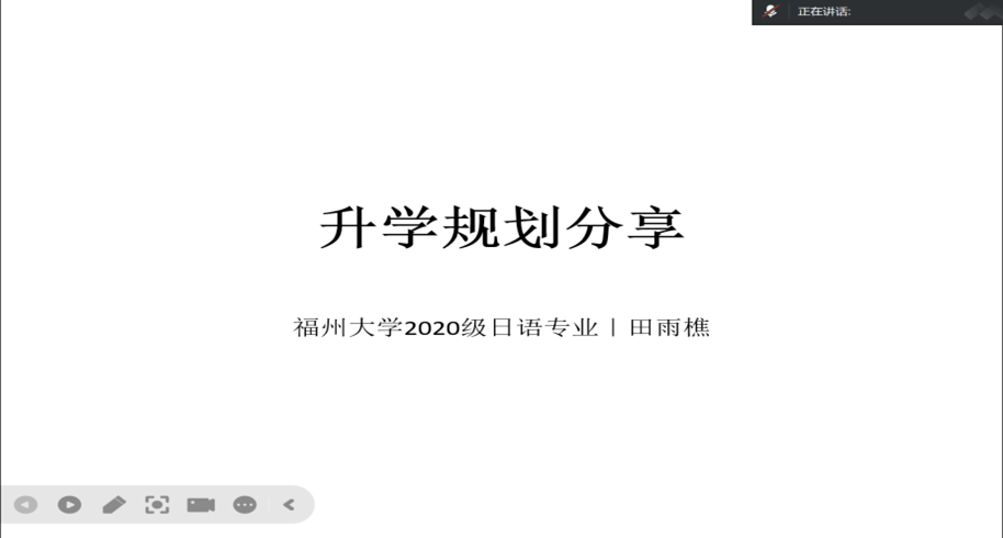 在日语专场,2020级毕业生田雨樵(现就读于新加坡国立大学)结合跨专业申请经历,建议学弟学妹重视绩点、提前准备语言成绩与文书,鼓励勇于试错。