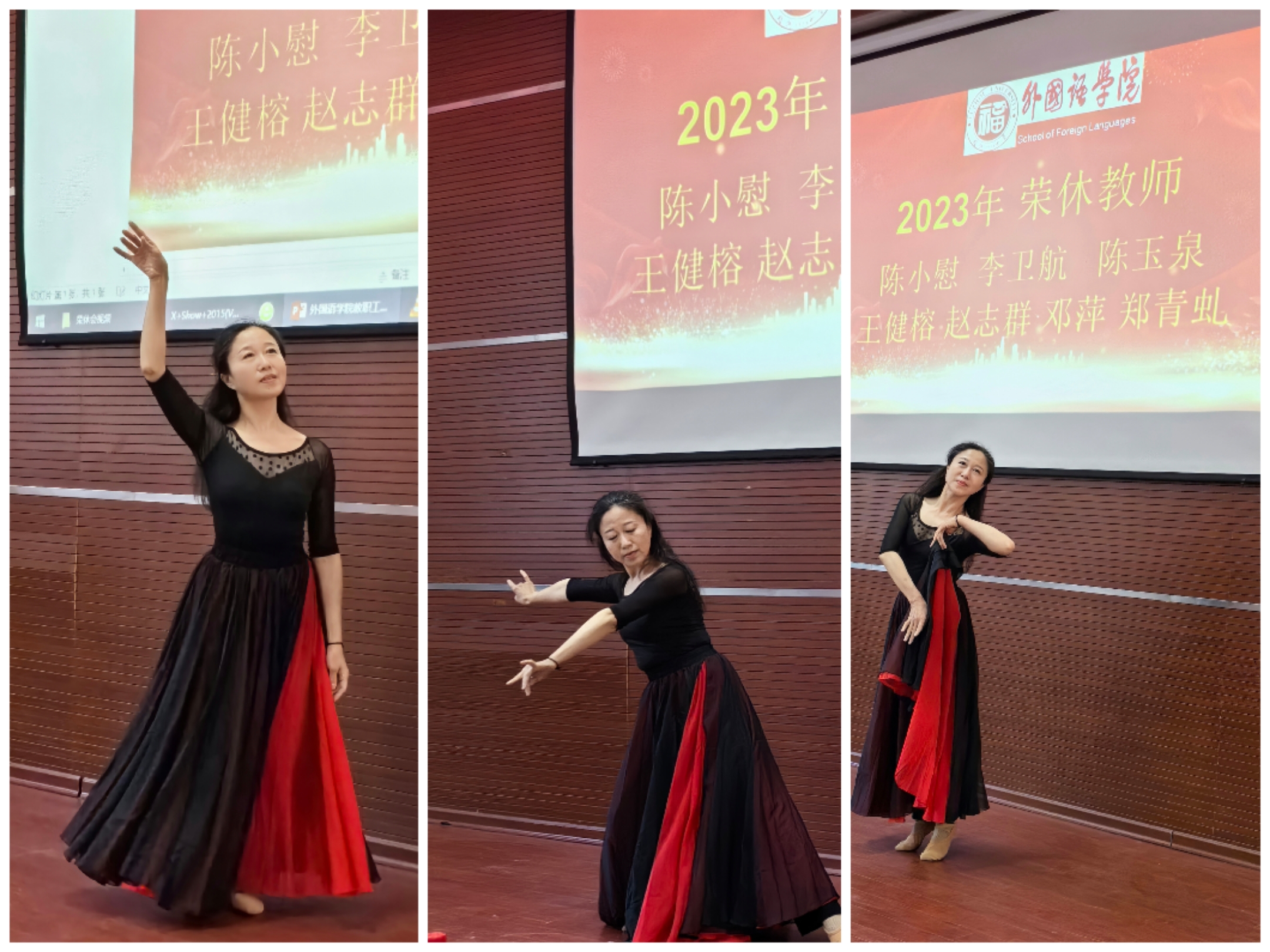 荣休教师郑青虬为大家献上一支舞蹈——《渡红尘》,她舞姿轻灵,宛如花间飞舞的蝴蝶,美得让人陶醉。学生代表带来诗朗诵和歌曲演唱,用青春朝气为荣休教职工送上诚挚的祝福。