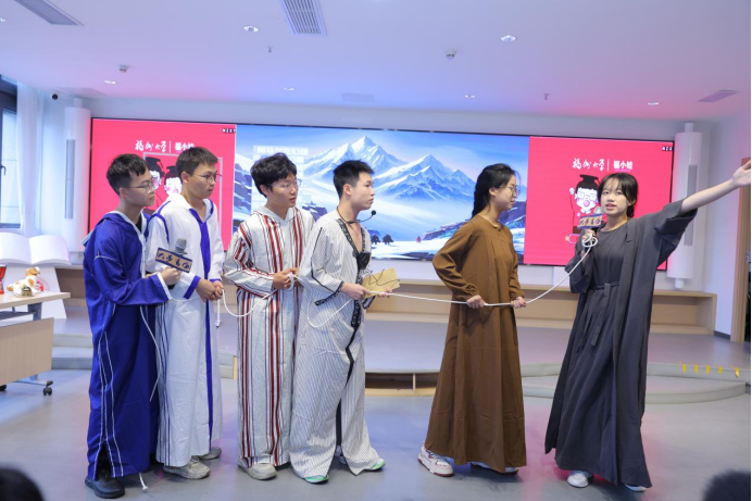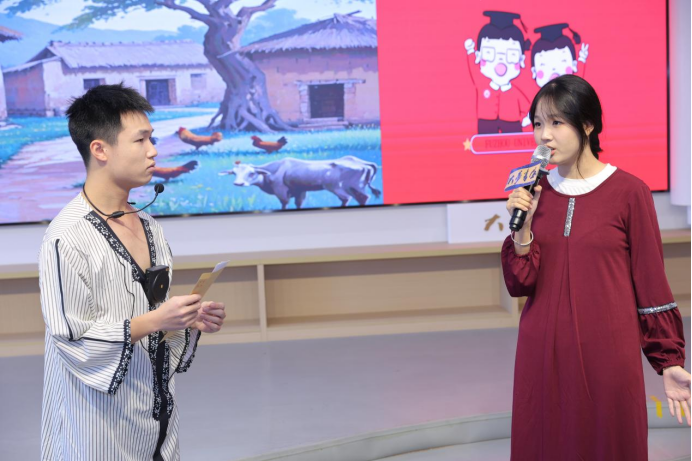 日语系带来了哆啦A梦的汉字起源探索之旅《汉字曰》。哆啦A梦与大熊为了完成作业上的汉字题,穿越时空来到中国,开启了一场汉字文化的探索之旅。从原始社会到现代,他们领略了汉字文化的博大精深,还遇到了来自越南、韩国、泰国的留学生。舞台剧不仅展示了书法与朗诵的魅力,还穿插了猜字谜小游戏,让小朋友们在欢乐中学习了汉字文化。