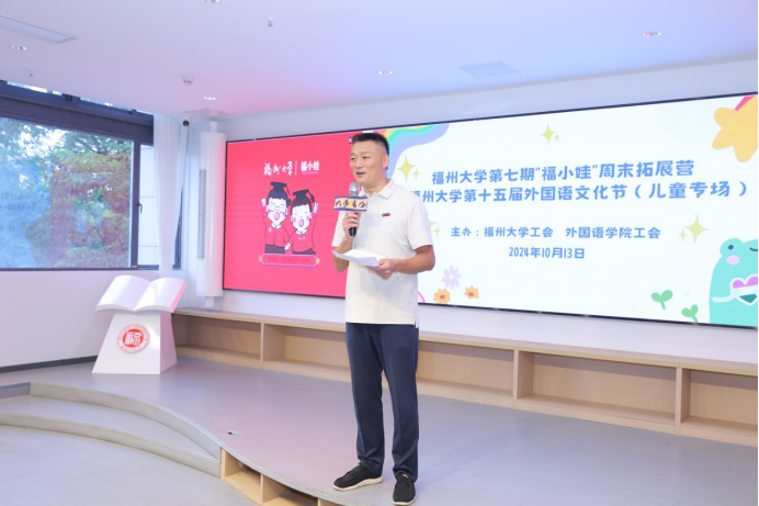 校工会常务副主席王群老师发表了热情洋溢的讲话。他首先对到场的家长、老师、同学们、小朋友们表示热烈的欢迎,并介绍了举办“福小娃”周末拓展营与外国语文化节的重要意义。王群老师特别感谢外国语学院党委的高度重视和大力支持,尤其是外国语学院工会老师们的精心策划和组织。他提到,此次活动共有10多名老师参与导演、组织、宣传等工作,47名学生参与演出及相关工作。正是老师们和同学们的辛勤付出,促成活动的成功举办。