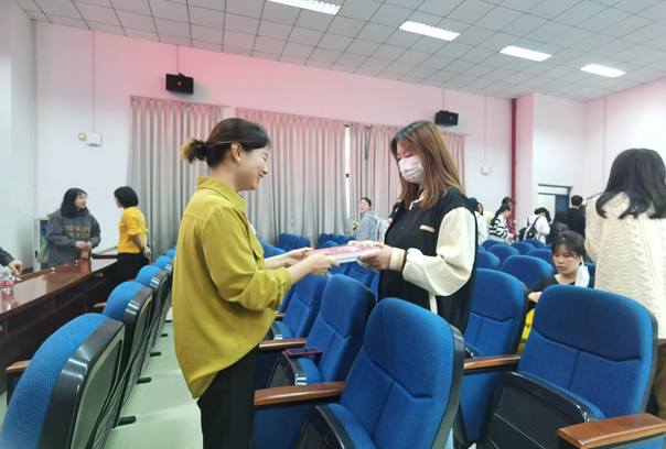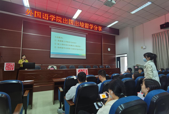 张密玉学姐首先与同学们进行问答小互动,并准备了精美的小礼品,以调动现场的气氛和同学们的热情。然后,张密玉学姐从本科生毕业后的三条出路规划、主流留学目的国家和地区介绍及硕士申请条件介绍、日语、德语专业学生留学目的国家推荐以及留学前期准备注意事项四个方面展开分享,让同学们对出国出境学习有了更加深入的了解,也为同学们的留学规划提供了许多意见、建议。