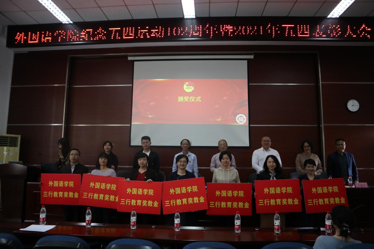 外国语学院课外实践基地举行揭牌仪式。仪式结束后,在场领导来宾依次为校级表彰获奖同学代表、院十佳大学生获奖同学代表、院五四表彰获奖同学代表、三行奖教金获奖教师、学大奖教金获奖教师颁奖。三行奖教金获奖教师叶颖老师、外国语学院学生会主席庄燕同学分别作为教师代表和学生代表发言。