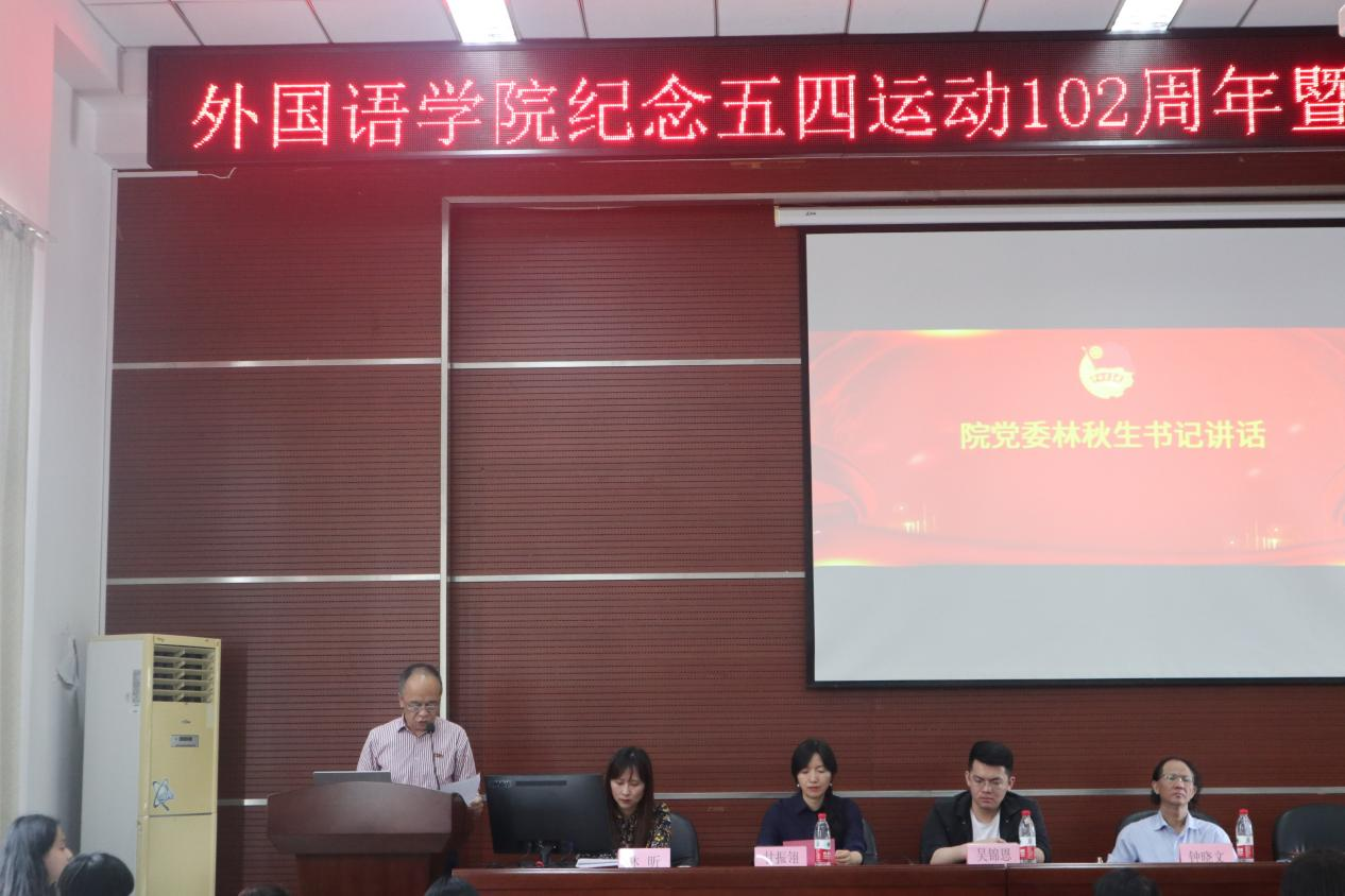 隆重举行了外国语学院纪念五四运动102周年暨五四表彰大会。福建省三行文化发展有限公司总经理吴锦恩先生、学大教育咨询有限公司福州分公司总经理张家精先生、学院党委林秋生书记、院长钟晓文教授、副院长林继红教授、院长助理甘振翎副教授、院长助理王建丰博士、学院师生代表及2018级、2019级本科生、研究生参加了此次表彰大会。
