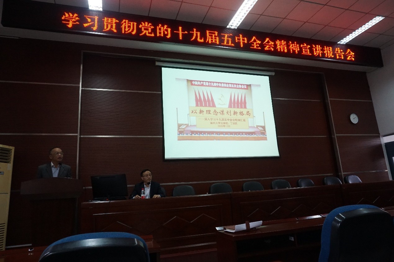 丁国民教授的本场宣讲报告会,围绕“新理念谋划新格局”的主题,紧扣习近平总书记在党的十九届五中全会上的重要讲话和全会审议通过的规划建议,从五中全会新精神、依法治国新方略、依法治校新思维等三个方面,对“十四五”时期我国经济社会发展的主要目标和习近平法治思想,进行了深入浅出、精辟到位的讲解。整场宣讲报告逻辑严密、资料详实、内容丰富,对于全院师生进一步准确理解和把握党的十九届五中全会精神,贯彻落实好党中央、省委和校党委决策部署很有指导意义。