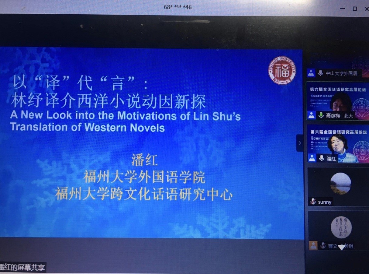 潘红教授于12月19日至20日应邀参加由中国英汉语比较研究会话语研究专业委员会主办、北京师范大学外国语言文学学院承办的“第六届全国话语研究高层论坛”。本次论坛采用腾讯会议及直播的形式,来自全国各地的600多位师生参加了论坛。