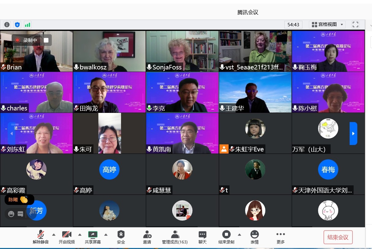 陈小慰教授应邀参加由山东大学翻译学院主办的“第二届西方修辞学高端论坛暨中西修辞学国际研讨会”,并在会上作了主旨发言。本次论坛采用线上会议的形式举办,山东大学(威海)副校长黄凯南教授,《当代修辞学》主编、复旦大学祝克懿教授,浙江科技学院王建华教授,《天津外国语大学学报》常务副主编、天津外国语大学田海龙教授,上海大学邓志勇教授,华中师范大学刘东虹教授,美国科罗拉多大学丹佛分校Sonja K. Foss教授,美国新墨西哥大学Karen A. Foss教授,美国密苏里州立大学Brian Ott教授,美国科罗拉多大学丹佛分校Barbara Walkosz教授等业内知名专家学者出席本次会议,来自全国多所高校的近两百名专家学者参加了本次论坛。