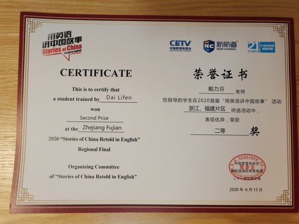 2020首届“用英语讲中国故事”活动浙江、福建片区终选活动及福州复选活动结果近日出炉,Av在线观看 戴力芬老师指导英专张一林同学表现优异,分别获得二等奖。