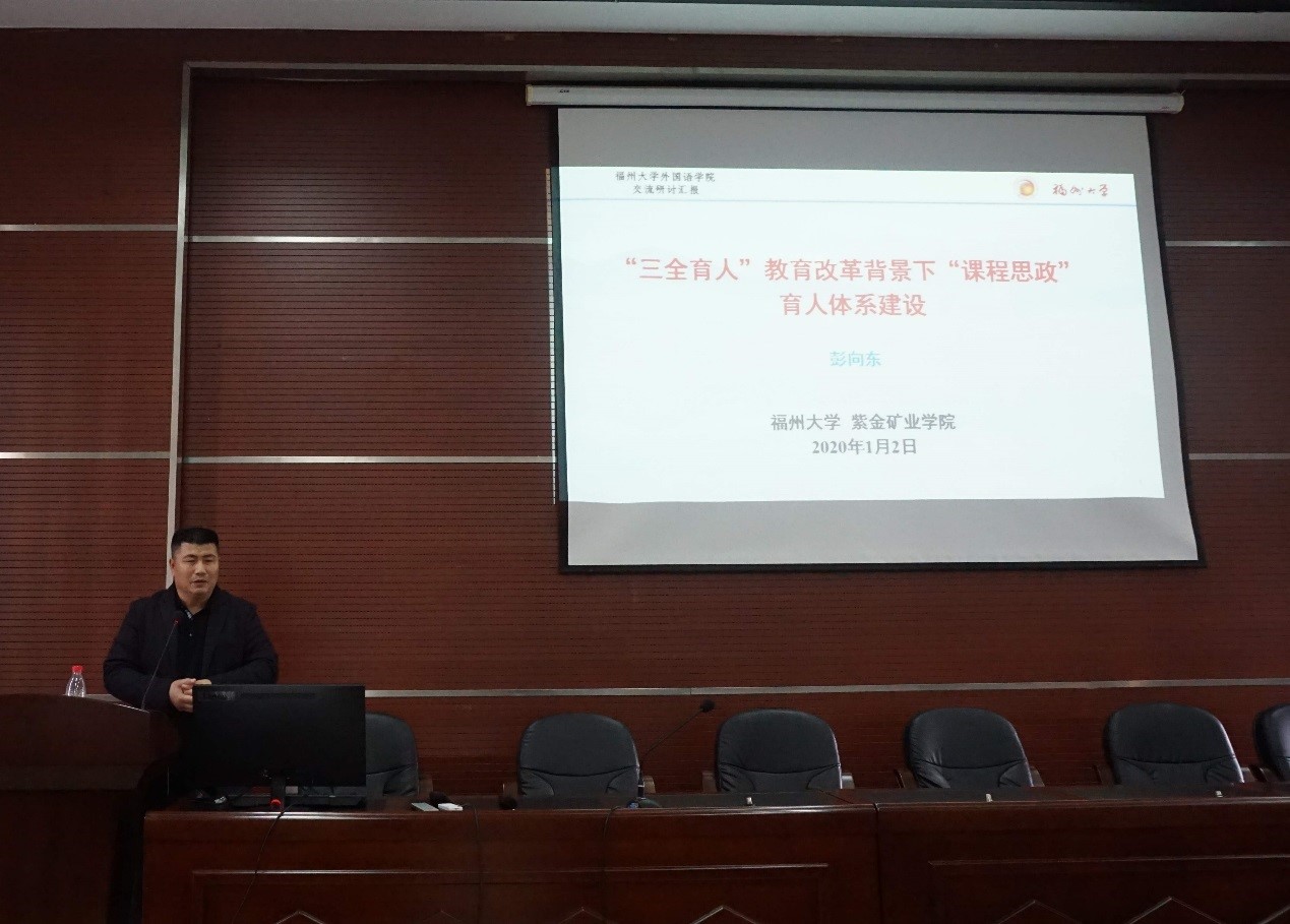 于1月2日下午邀请紫金矿业学院副院长彭向东教授作题为:“三全育人”教育改革背景下“课程思政”育人体系建设的报告。报告会由陈伟民书记主持,全院100余名教师参加。