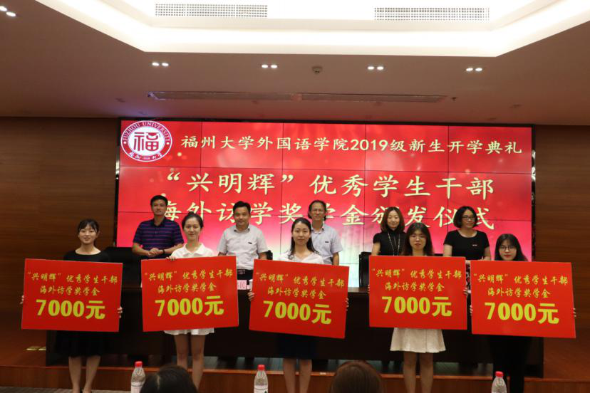 典礼在庄严的国歌声中开始。随后,林继红副院长宣读了“兴明辉”优秀学生干部海外访学奖学金获奖名单,院领导和奖学金捐赠者谢鸿基、蒋晖伉俪分别为获得奖励的同学颁奖。
