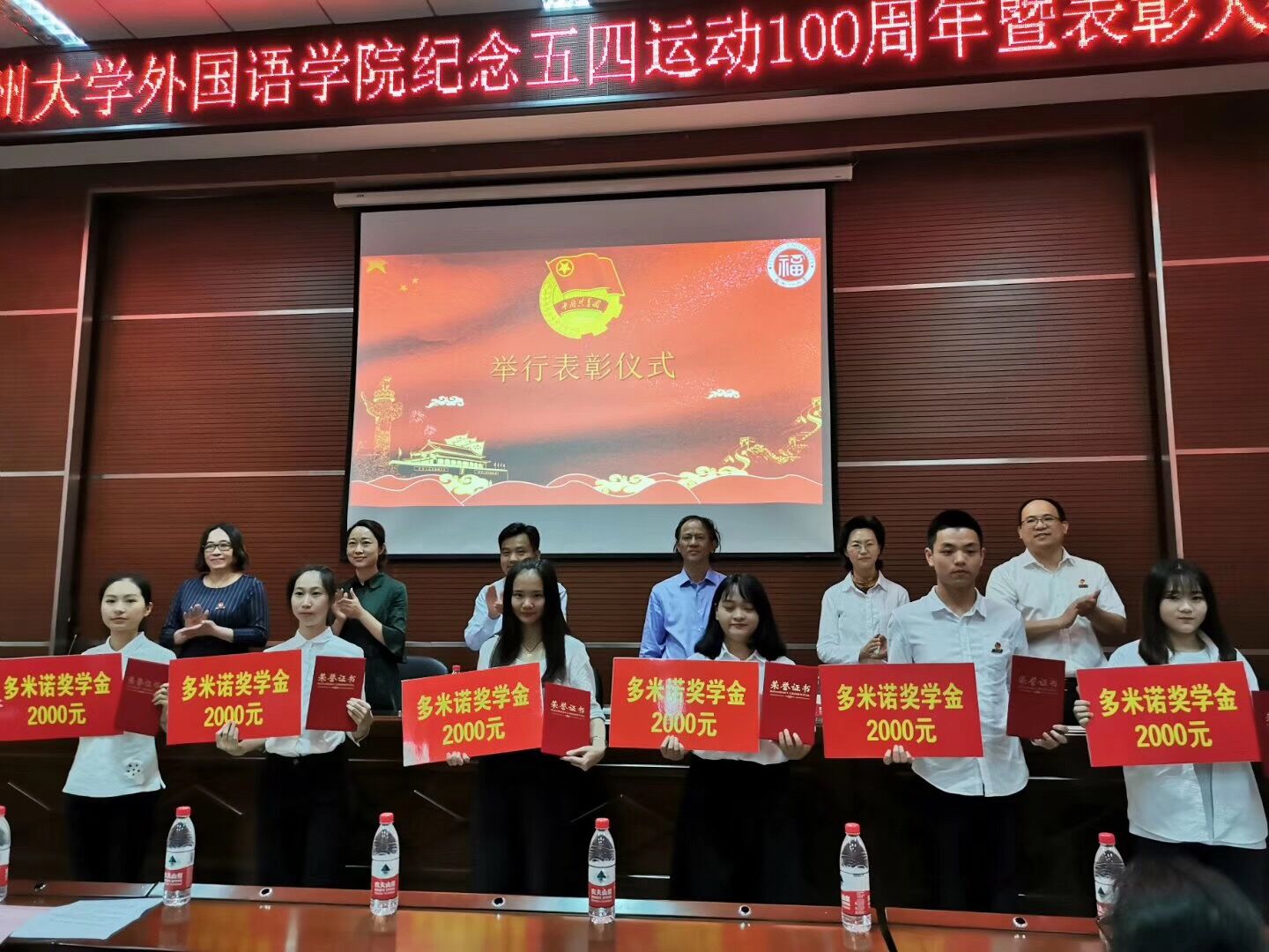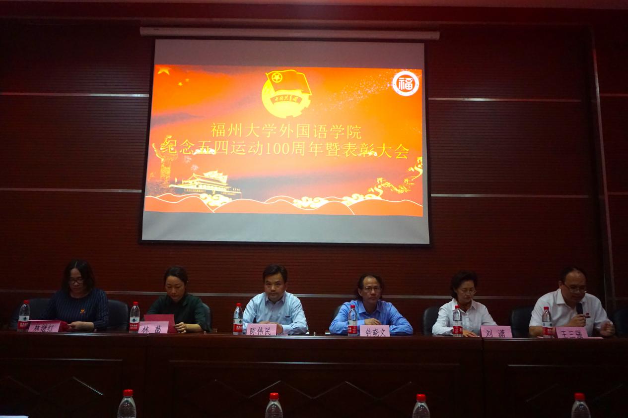 5月5日晚,外国语学院纪念五四运动100周年暨表彰大会在外国语学院三楼会议室举行。外国语学院党委陈伟民书记、负责学院行政工作的副院长钟晓文教授、党委王三强副书记、副院长林继红教授、多米诺人力资源总监林菡和九二萤火奖学金评审委员会代表92级校友刘潇、叶文娟出席了大会。