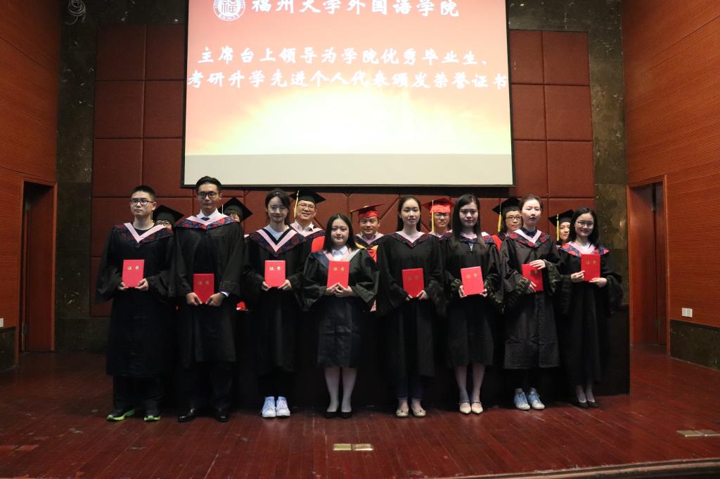 毕业典礼在庄严的国歌声中拉开序幕。林继红副院长宣读了《关于表彰2019届外国语学院优秀毕业生的决定》和《关于表彰2019届外国语学院考研升学先进个人的决定》。随后,院领导为获奖学生代表颁发荣誉证书。