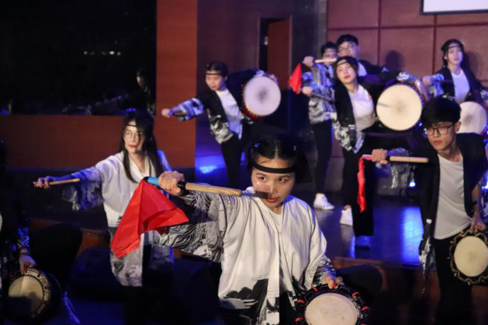 2019届日语班同学与外籍教师黑冈佳柾、池泽充弘合唱歌曲《那些年》引领在场毕业生们回忆大学的美好时光;大一到大四太鼓队成员带来的太鼓节目《凧舞琉风》更是以气势磅礴的表演展现了Av在线观看