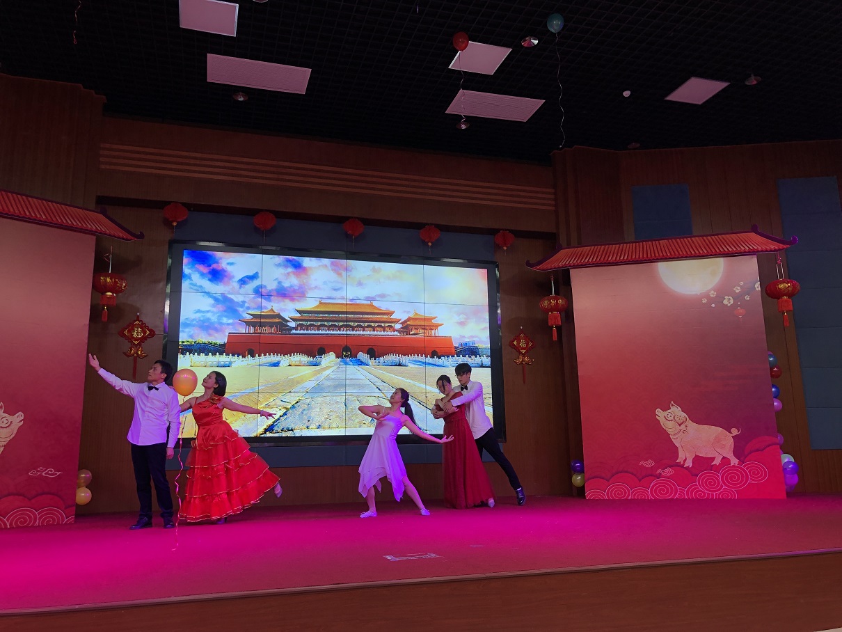 这场联欢会精彩纷呈。德语外教荣智康老师独唱歌曲《十年》,那流利的中文和优美的歌声让全场观众如痴如醉,所有人都为其疯狂点赞。英语系叶颖老师的《多语种电影配音:延禧攻略》,用英语、闽南语、粤语等语种进行配音,幽默诙谐,让观众们捧腹大笑。公一教研室邓萍老师的太极剑表演和学工组唐斌湖老师的书法展示同时进行,一动一静,一刚一柔,让观众赞叹不已。日语系中外教师的集体舞蹈《恋爱幸运曲奇》,充满了青春阳光气息,把整个大厅变成了欢乐的海洋。公二教研室杨海晓老师、院办庄颖慧老师的爵士舞舞姿曼妙,动感奔放,展现了外院女教师的青春风采。学生表演的诗朗诵《怎样做好新时代青年》积极向上,振奋人心。公二教研室的集体舞蹈《我和我的祖国》饱含对伟大祖国的深情厚谊,激荡人心。王冰老师与林孟夏老师的男女生二重唱《月之故乡》歌声优美,深情款款,把联欢会的气氛推向了高潮。在这首充满柔情的歌声中,晚会圆满落下帷幕。