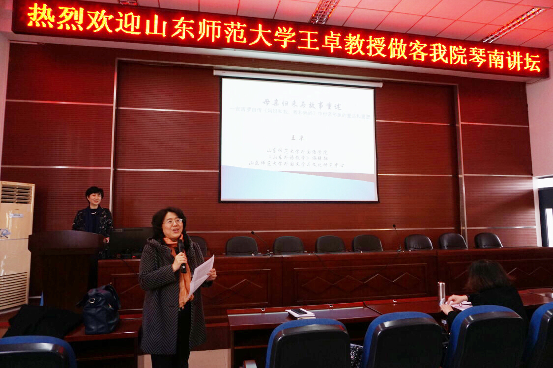 师生带来讲座:母亲归来与故事重述——安吉罗自传《妈妈和我,我和妈妈》中母亲形象的重述和重塑。讲座由院长潘红教授主持。