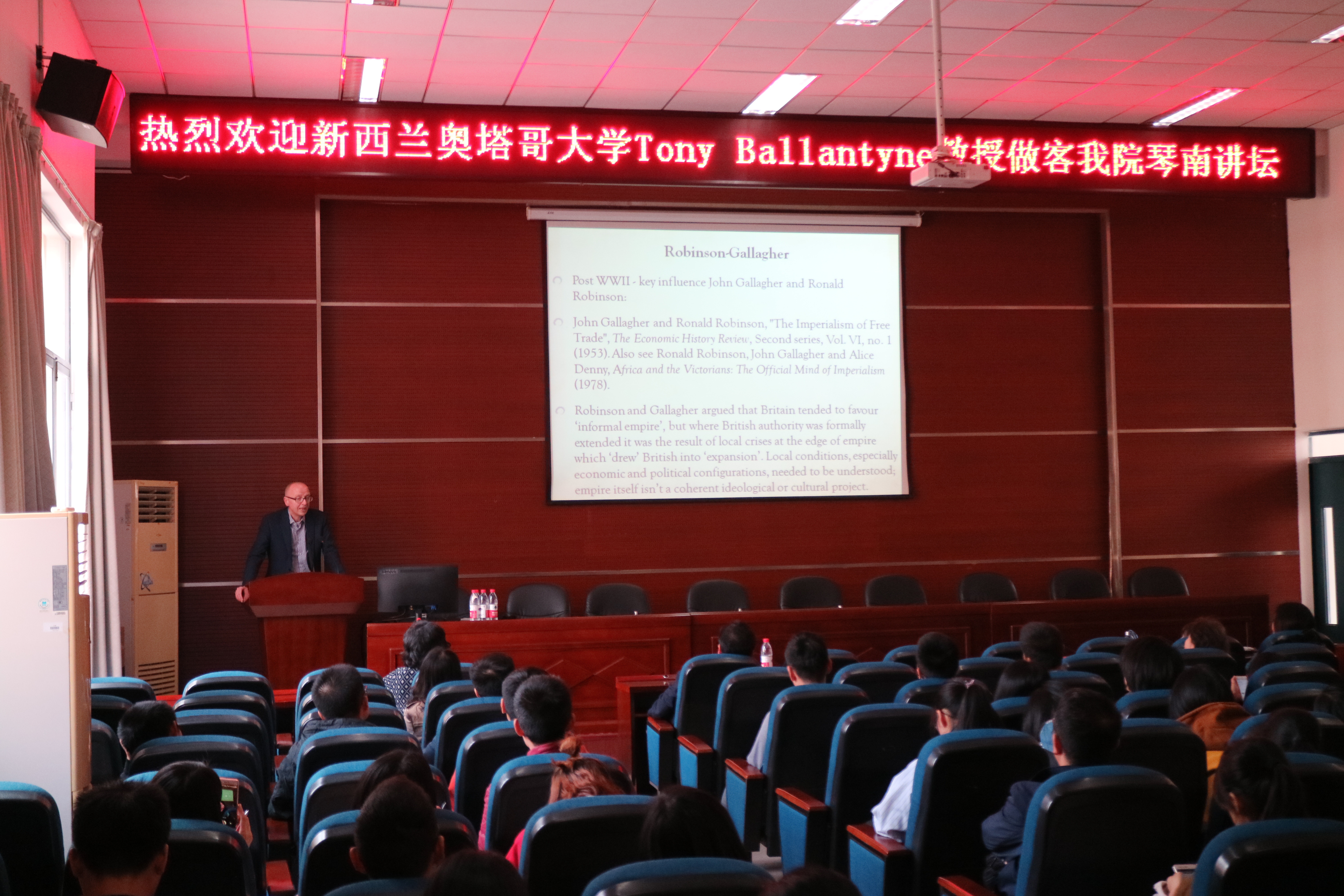 大会议室顺利举行。新西兰奥塔哥大学Tony Ballantyne教授为本场讲座嘉宾,讲座题为“话语与帝国:大英帝国研究的方法变迁”。