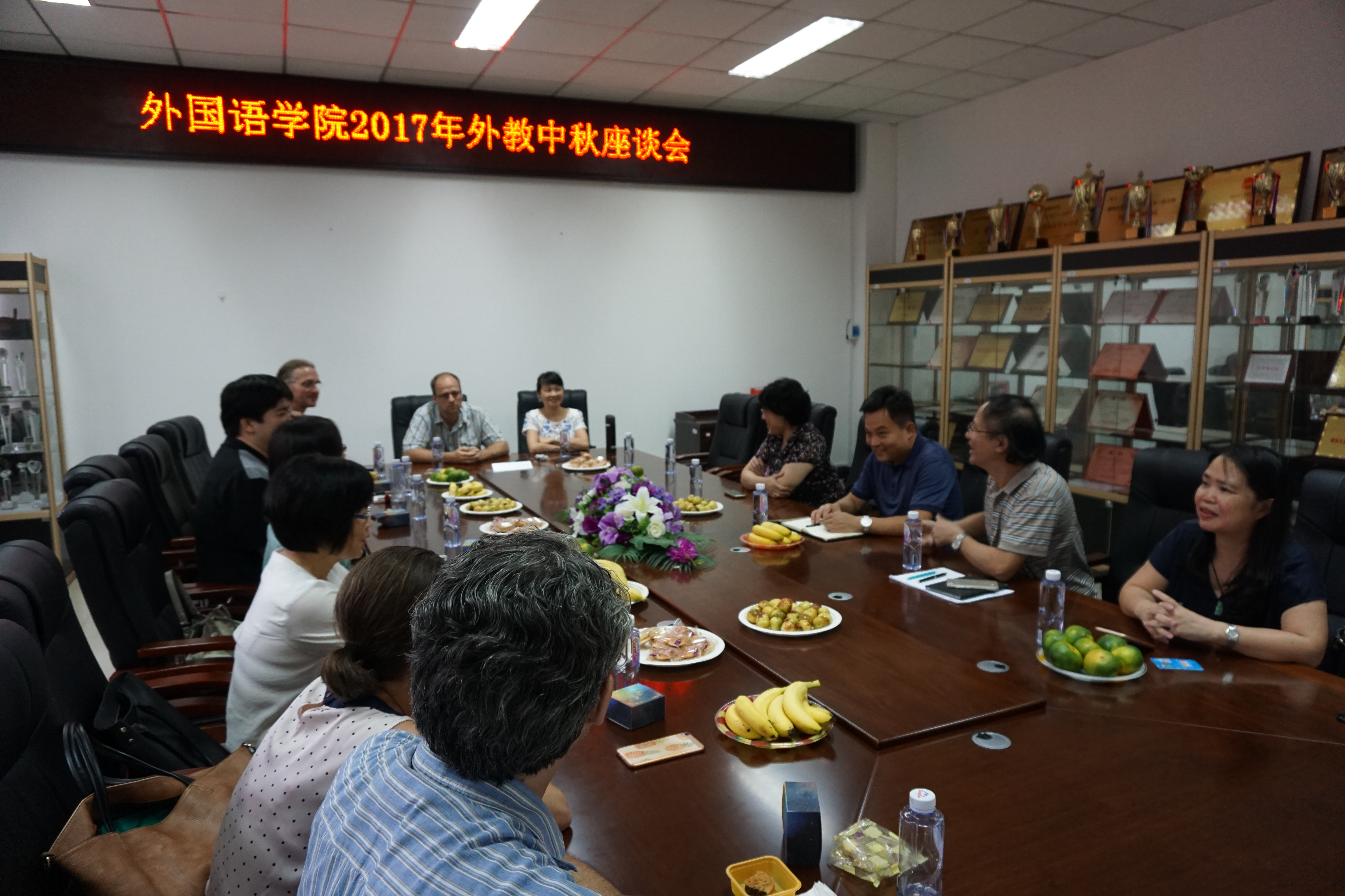 召开了2017外教中秋座谈会。院党委陈伟民副书记(主持)、潘红院长、钟晓文副院长、王平副院长莅临会议,全院全体外籍教师、各系部负责人出席会议。会议由钟晓文副院长主持。