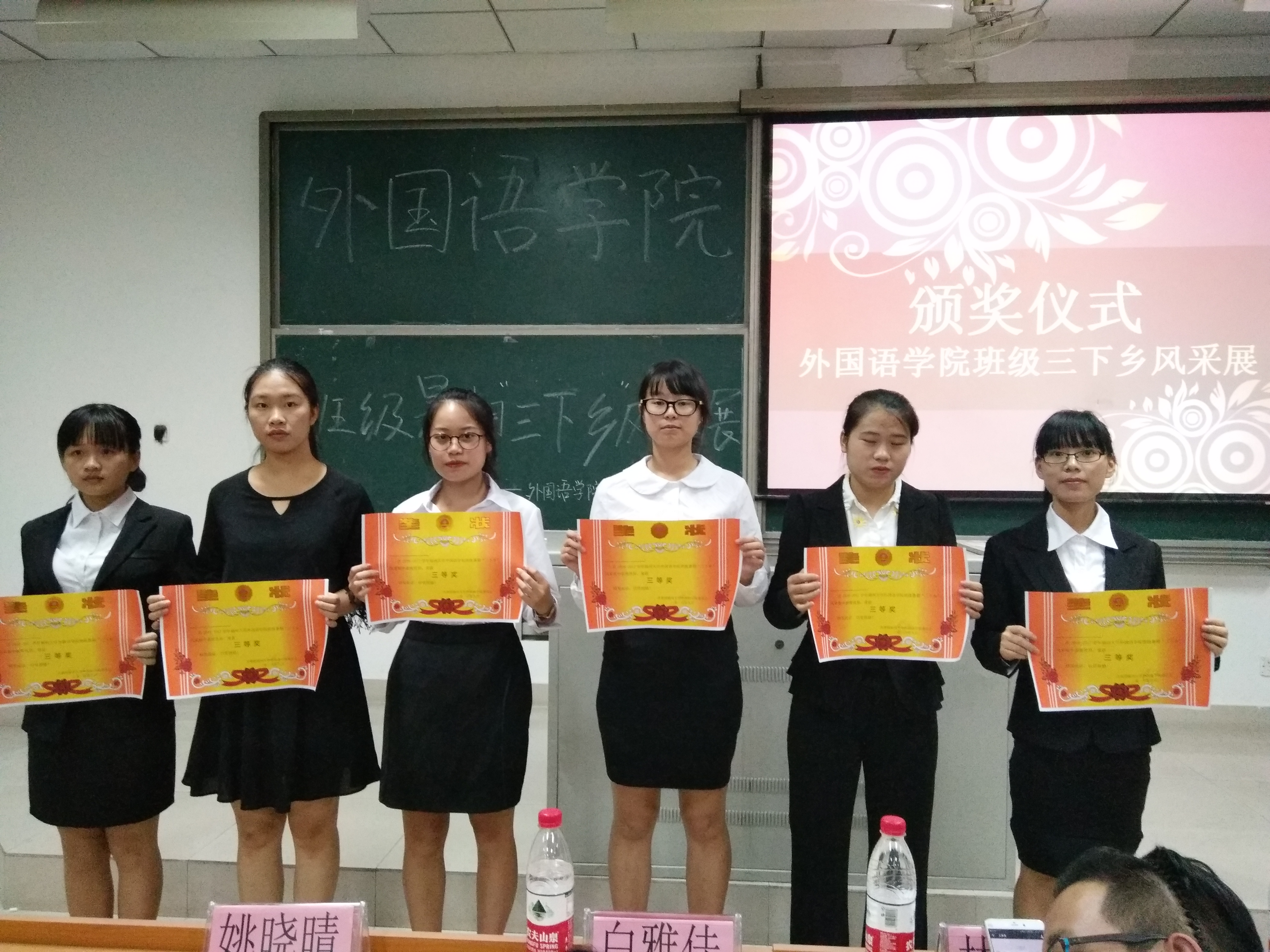 2016年暑期各学院在校团委开展了以“青春建功十三五,携手共筑中国梦”为主题的大学生志愿者暑期文化科技卫生“三下乡”社会实践活动,在此期间,外国语学院积极响应,各个专业的班级实践队积极推进下乡活动。此次风采展旨在展现外国语学院各班级的实践成果,体现班级三下乡风采,总结“三下乡”经验,表彰先进集体。“艰辛知人生,实践长才干”,“三下乡”暑期社会实践活动,是大学生了解社会,开阔视野的重要途径,外国语学院学子用他们自身的实践行动去关心、了解和融入社会,值得赞赏。