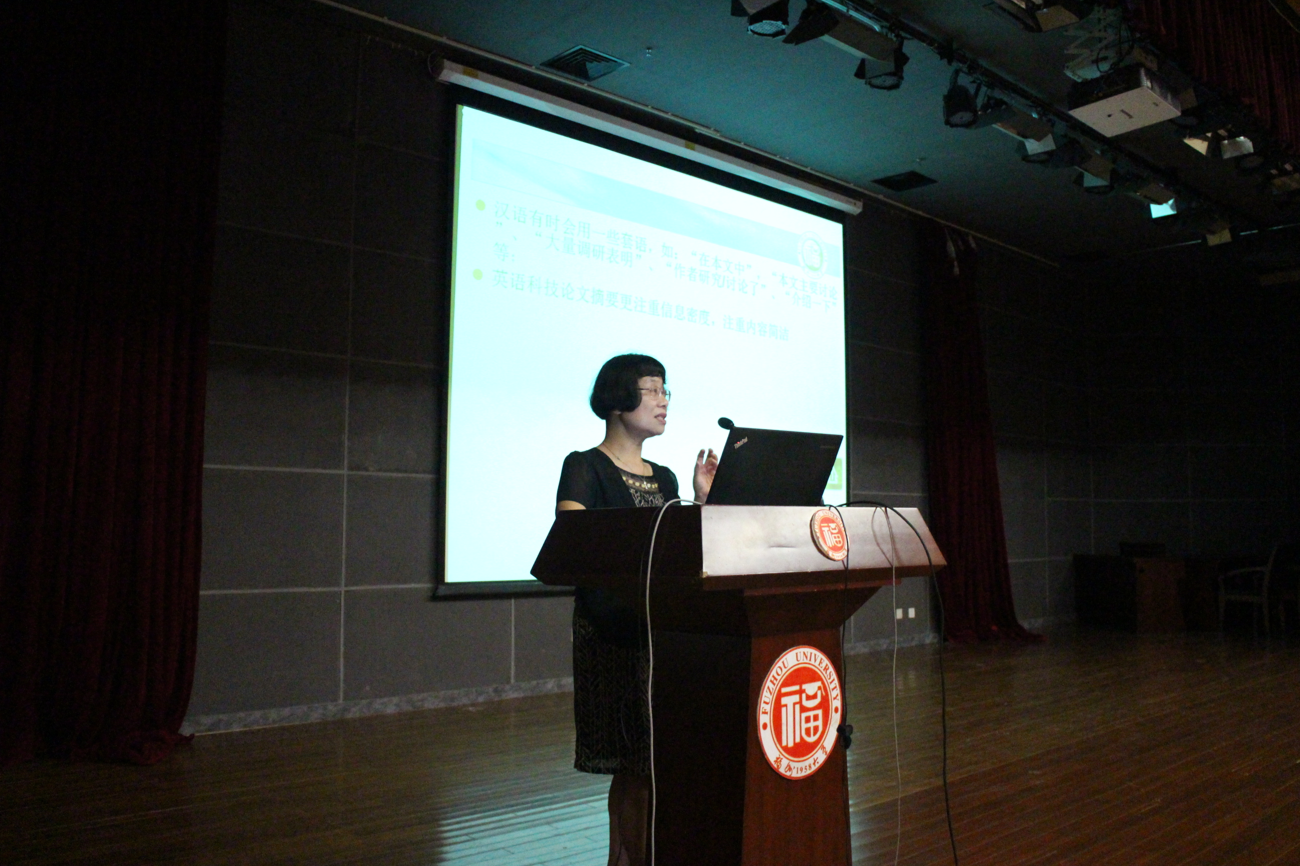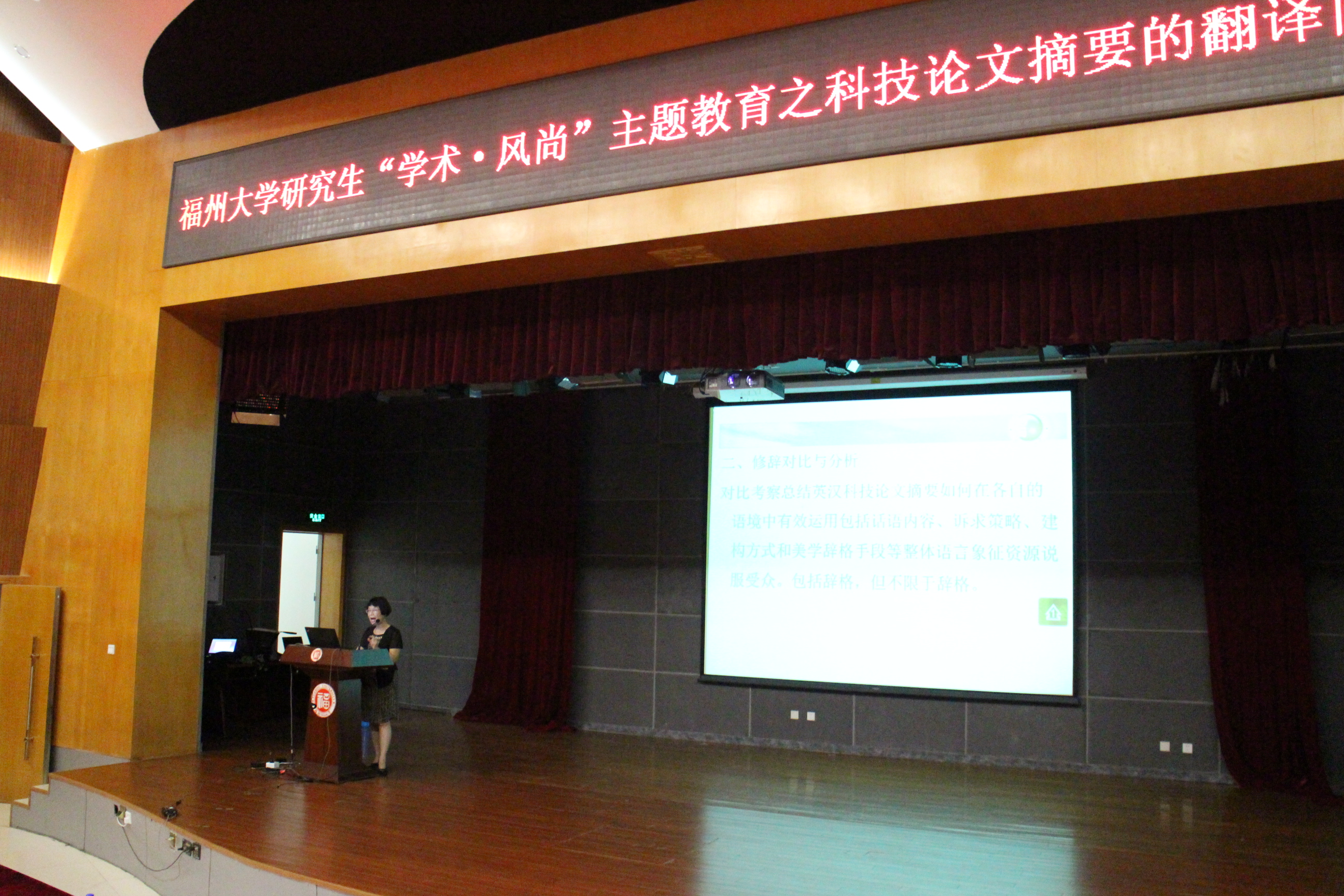陈小慰博士为中国译协翻译理论与翻译教学委员会委员、中国译协理事、中国比较文学学会翻译研究会常务理事。主要研究方向是翻译理论与实践、修辞与翻译。本次主题教育报告会上,陈小慰博士就科技论文摘要的翻译问题向在场观众做了详细解说,以因论文翻译不当导致严重问题的实例来提醒同学们论文翻译准确性的重要性,并且点出了科技论文摘要的翻译中常见的问题,同时给出正确的表达方法。她分别从中英语言及表达方式差异、修辞以及语法等方面来指出和纠正在翻译过程中由于中文和英文表达方式和语言习惯不同导致的翻译不当,并教授了同学们一些翻译的技巧,同时强调科技论文翻译的严谨性、权威性等重要元素。讲座现场座无虚席,反响热烈。