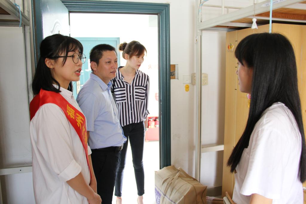 9月5日上午9时许,院党委周强副书记与团委书记林昕老师亲临迎新现场,向参与迎新的工作人员们表示慰问,随后走进新生宿舍看望新生及新生家长。