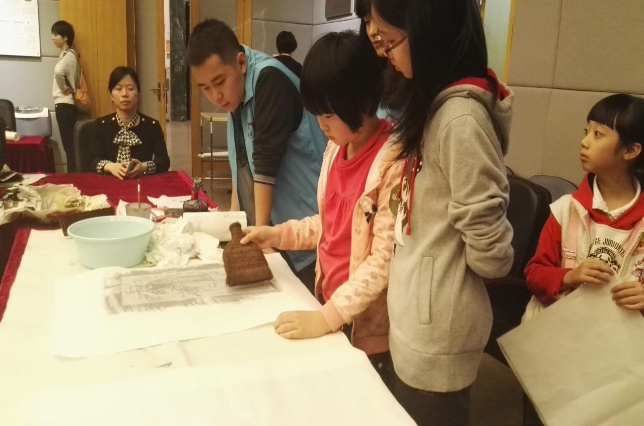 在了解悠久的茶文化并欣赏了高雅的茶道表演后,主讲老师向小朋友们演示拓印的方法,由志愿者在一旁协助摆好道具。刷剔花纹、覆盖宣纸、点蘸浓墨、轻扑拓片……在体验拓片环节,小朋友们排队等候,志愿者两人一组,耐心地指导并帮助小朋友们完成碑文和碑像拓印的一道道工序,并讲解拓印技巧,与小朋友和家长进行交流互动,最终拓印出一张张精美的拓本。